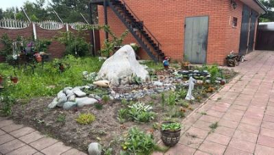 На участке высажены несколько кустов смородины, крыжовник, барбарис, несколько яблоневых, сливовых деревьев, растет клубника и жимолость. Напротив дома расположен вместительный хозблок и уличный туалет. Территория ухожена, есть беседка для детей, песочница, батут, соседи только с двух сторон. В деревне работают два продуктовых магазина, пункт выдачи товаров Озон, организована доставка