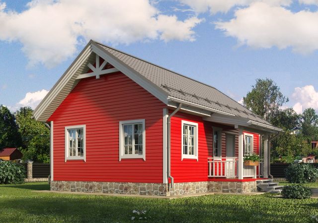 Небольшой одноэтажный коттедж «ИСКАНДЕР» выглядит просто и стильно. У него двускатная крыша и французские окна, а также аккуратное крыльцо с перилами. Планировка предусматривает две комнаты, кухню-столовую, холл, санузел, тамбур и техническое помещение. Можно оборудовать для постоянного проживания.