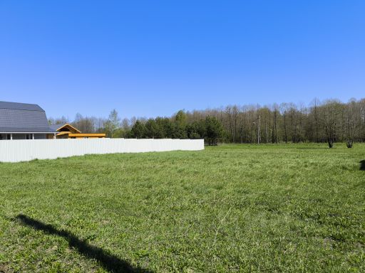 Участок 8 соток, без какой либо обработки. Участок прямоугольный 20х40 м. Порос небольшим леском (берёзы). Участок на небольшой горке относительно поселка. На территории поселка стоят столбы с электричеством, к ним подключают дома. Газ проходит по территории поселка. Магистраль по дороге, через участок западнее.