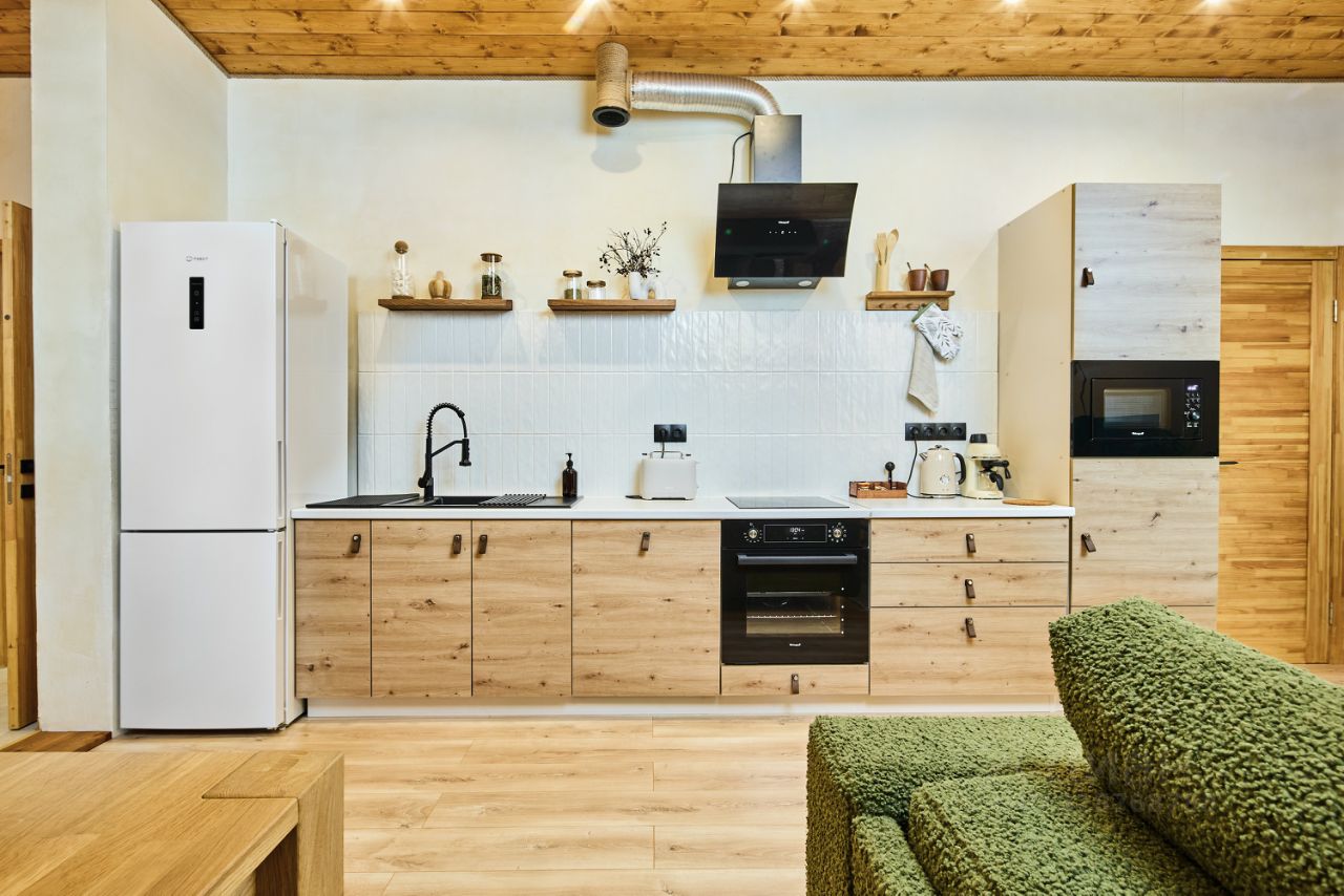 Зона кухни оборудована всем необходимым: микроволновка, холодильник, духовой шкаф, посудомоечная машина, варочная панель, чайник, тостер, рожковая кофеварка. Посуда, столовые приборы, формы для запекания.