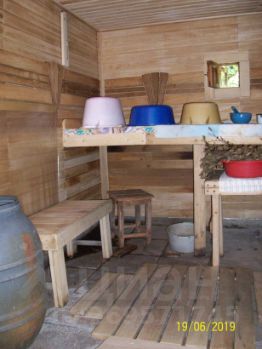В доме оборудована душевая кабина с подачей воды из колодца и подогревом через электрический бойлер — никаких уличных конструкций.