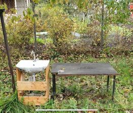 От трубы шланг подсоединен к раковине на улице.